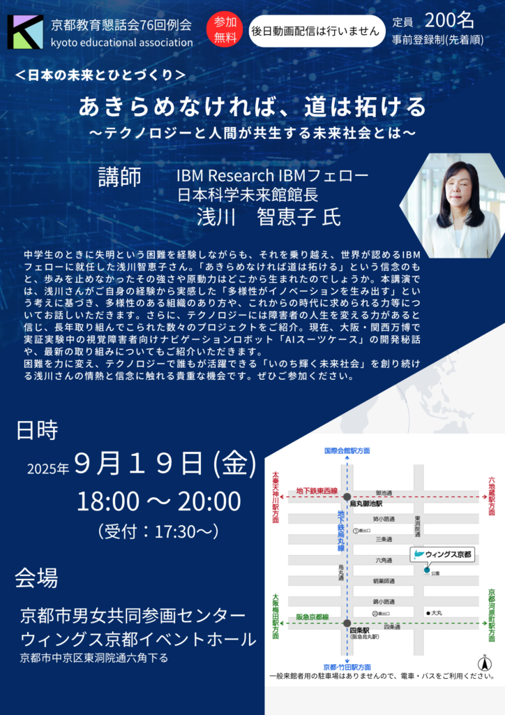 学生のときに失明という困難を経験しながらも、それを乗り越え、世界が認めるIBMフェローに就任した浅川智恵子さん。「あきらめなければ道は拓ける」という信念のもと、歩みを止めなかったその強さや原動力はどこから生まれたのでしょうか。本講演では、浅川さんがご自身の経験から実感した「多様性がイノベーションを生み出す」という考えに基づき、多様性のある組織のあり方や、これからの時代に求められる力等についてお話しいただきます。さらに、テクノロジーには障害者の人生を変える力があると信じ、長年取り組んでこられた数々のプロジェクトをご紹介。現在、大阪・関西万博で実証実験中の視覚障害者向けナビゲーションロボット「AIスーツケース」の開発秘話や、最新の取り組みについてもご紹介いただきます。